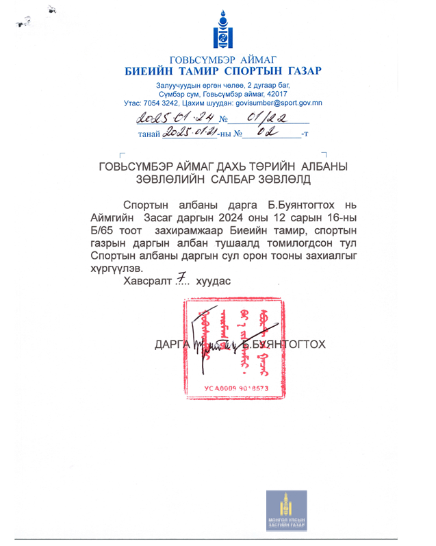 Утас: 94114420 И-мэйл: govisumber@sport.gov.mn