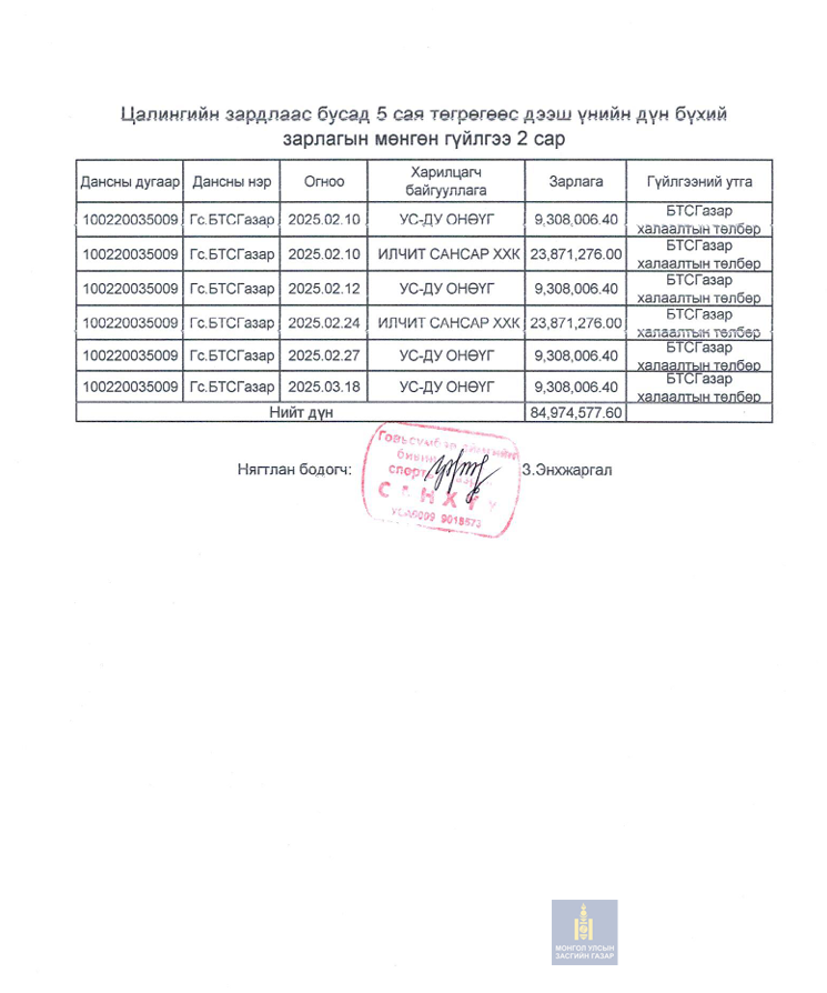5 саяаас төгрөгнөөс дээш үнийн дүн бүхий зарлага