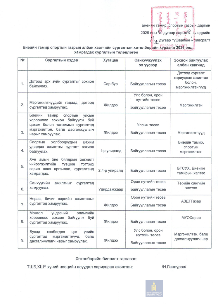 БИЕИЙН ТАМИР, СПОРТЫГ ХӨГЖҮҮЛЭХ ҮНДЭСНИЙ ХӨТӨЛБӨР